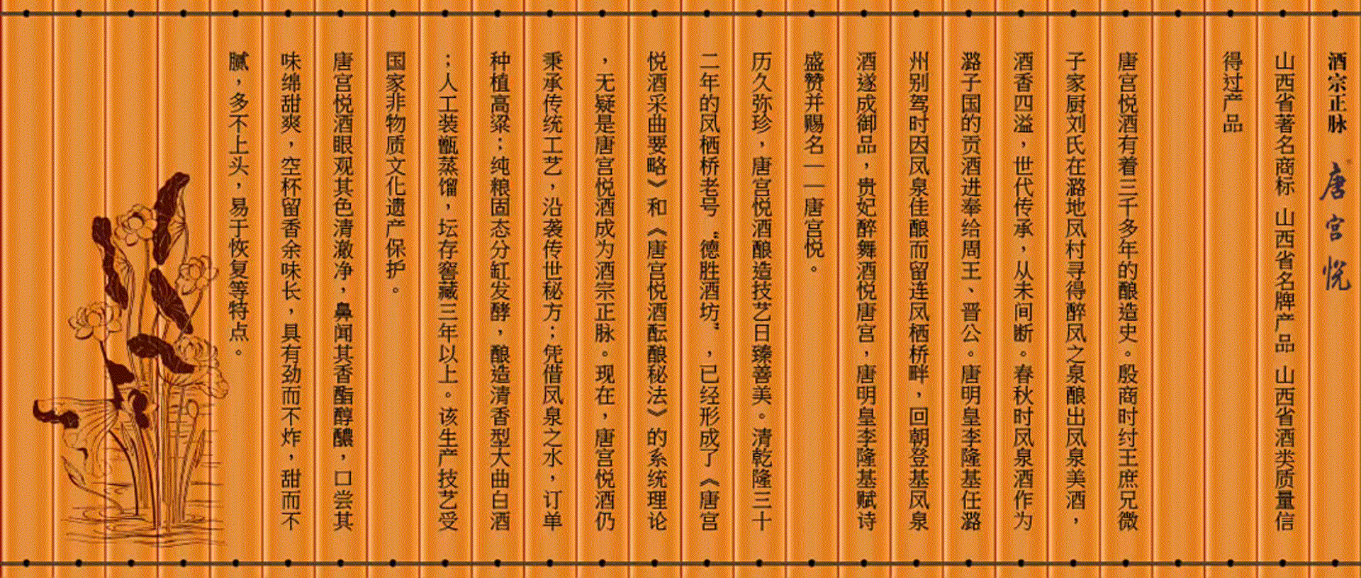 鳳棲橋釀業(yè)有限公司歷史悠久。從殷商微子家廚劉氏尋鳳泉釀酒至今,已有三千多年釀造史。劉氏后裔代傳代善, 才有唐明皇李隆基賜名“唐宮悅”,到清乾隆三十二年的鳳棲橋老號“德勝酒坊”已形成了《唐宮悅酒采曲要略》和《唐宮悅酒醞釀秘法》的系統(tǒng)理論的系統(tǒng)理論,直至建國初期的一九五二年才被當(dāng)時的潞城邊區(qū)酒坊所接管,一九七四年改邊區(qū)酒坊成立國營潞城縣酒廠,二00六年改制為現(xiàn)公司公司地處晉冀豫三省通衢素有“商賈云集旱馬頭”美譽(yù)的微子古鎮(zhèn)……【詳細(xì)】 |